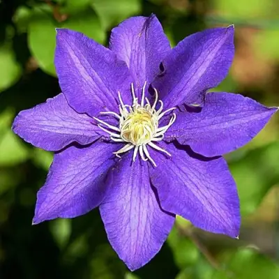 Главное украшение сорта — крупные цветки диаметром 15–20 см. Они раскрываются двумя волнами: в конце весны и повторно в конце лета, а насыщенный сине-фиолетовый оттенок с серебристым обратным свечением и бордовыми тычинками делает посадку эффектной и запоминающейся. Цветение длительное, выразительное и превращает любую опору в живую декоративную конструкцию.