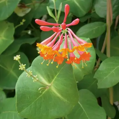 Главная причина, почему садоводы стремятся купить жимолость именно этого сорта — её цветение. Дромпор Скарлетт образует трубчатые ярко-алые цветки с тёплым оранжевым оттенком внутри венчика. Бутоны собраны в изящные соцветия и появляются на растении всё лето — с июня и до начала осени. Аромат лёгкий, но цветки активно привлекают пчёл, бабочек и создают живую атмосферу в саду. После цветения созревают декоративные красные ягоды, усиливающие декоративный эффект.