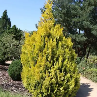 Все внешние побеги круглый год ярко-оранжево-желтые, контрастирующие с темно-зеленой внутренней листвой.