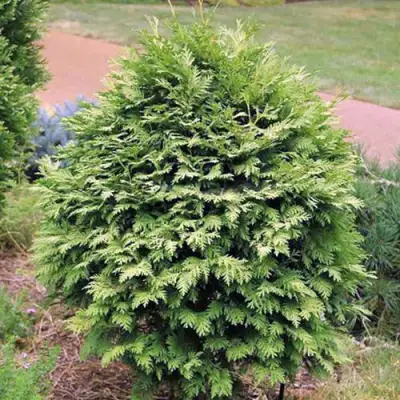 Тую Вареана Лютесценс часто используют как одиночное растение — в центре клумбы или на газоне. Благодаря плотной кроне её высаживают рядами для создания зелёных экранов, жизнерадостных бордюров и архитектурных композиций. Особенно эффектно туя смотрится в сочетании с темнохвойными культурами или краснолистными кустарниками.