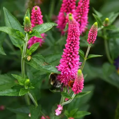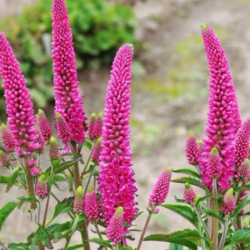 Вероника 'Ферст Лав' образует аккуратный кустик высотой 30-40 см, что делает ее отличным решением для оформления переднего плана цветников. Ланцетные листья темно-зеленого цвета придают растению богатый и изящный вид, а зубчатые края листьев добавляют свой особенный шарм. Ярко-розовые соцветия-колоски обильно украшают куст в июне и июле.