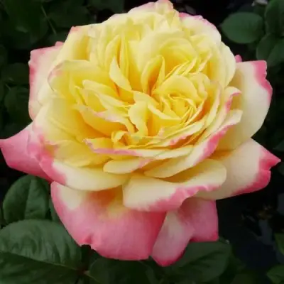 Цветы розы Кордес Джубили поражают своим выразительным внешним видом. Бутоны сначала открываются в насыщенном темно-малиновом цвете, а затем превращаются в потрясающие цветы диаметром до 12 см. Основная окраска цветка аппетитный желто-красный цвет, а края лепестков обрамлены ярко-розовыми или красными оттенками, что создает эффектный контраст. Форма цветка варьируется от шаровидной до розетковидной, что добавляет дополнительную привлекательность. Каждая роза состоит из 50-60 густомахровых лепестков, между которыми сохраняется легкое дыхание аромата.
