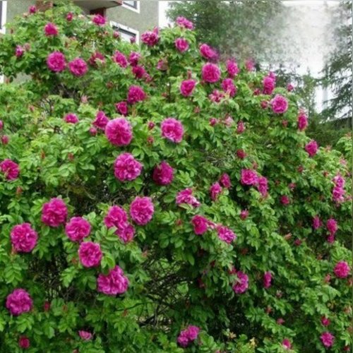 Роза Ханса начинает цвести в начале лета и радует глаз до первых заморозков. Цветки крупные, махровые, диаметром 7–10 см, насыщенного розово-пурпурного цвета. Плотные лепестки формируют объемные чашевидные цветки, а сильный пряный аромат наполняет сад особой атмосферой. Многократное цветение делает куст декоративным на протяжении всего сезона.